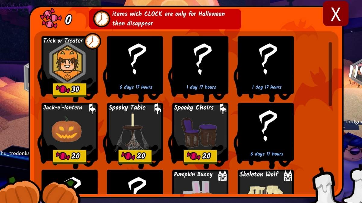 Когда вы соберёте достаточно конфет, вы сможете использовать их в Хэллоуинском магазине, которым управляет персонаж Пугало и который находится в лобби игры.