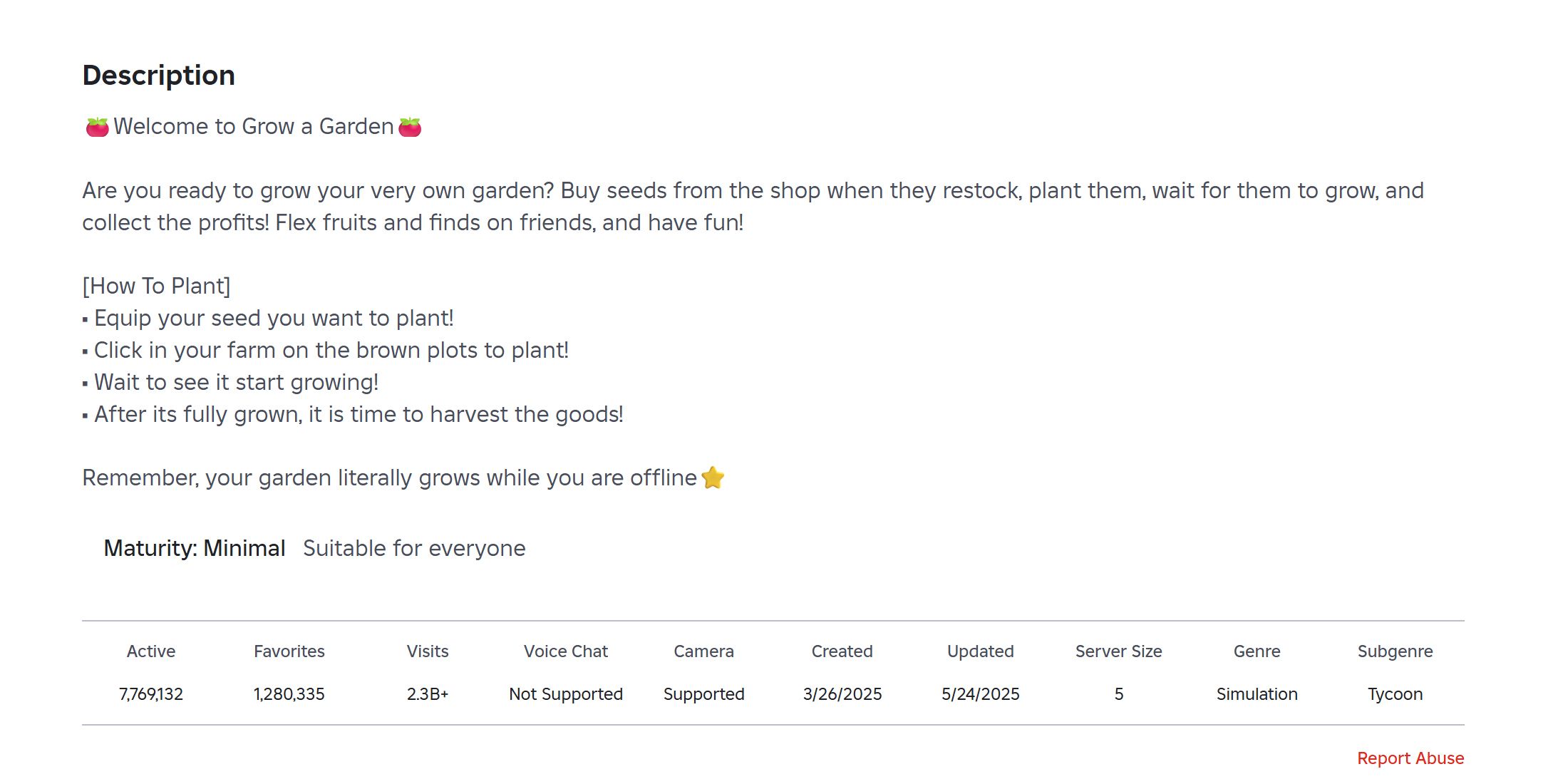 Игра про выращивание сада заняла первое место в топе Roblox вскоре после выпуска несколько месяцев назад и с тех пор только набирала популярность. После запуска обновления 1.07.0 сегодня утром она достигла поразительной цифры в 7,769,132 одновременных игроков за раз, превысив совокупное количество топ-100 игр Steam (7,316,443) за тот же период времени.