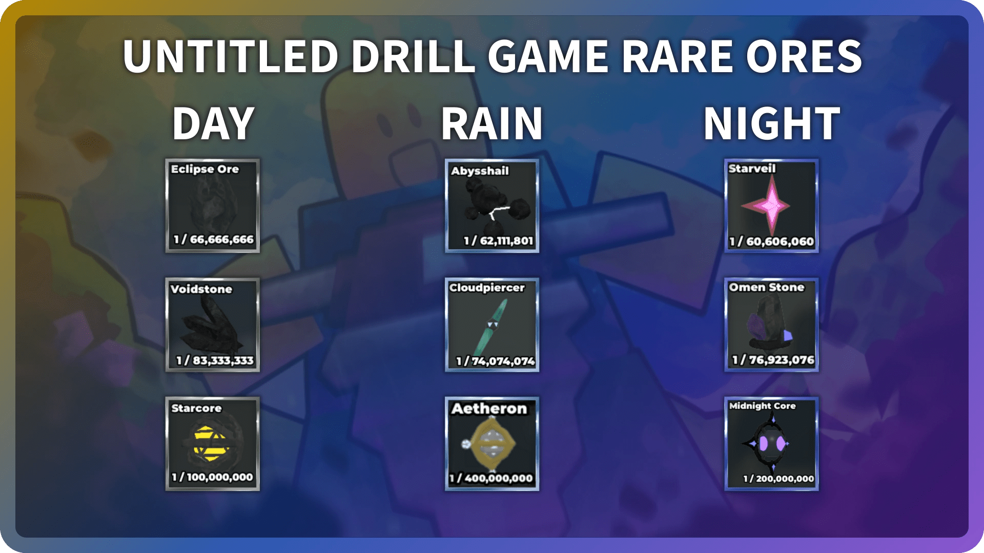 Самые редкие руды, которые вы можете добыть, — это Эферон (Дождь), Полночьядро (Ночь) и Звёздное ядро (День).