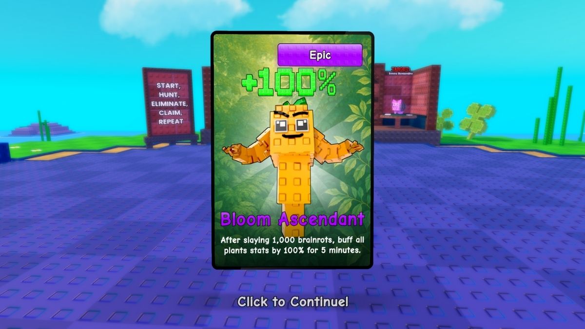 | Bloom Ascendant | Epic | 0,92% | После 1000 убийств Brainrot все растения получают +100% к характеристикам на 5 минут. |