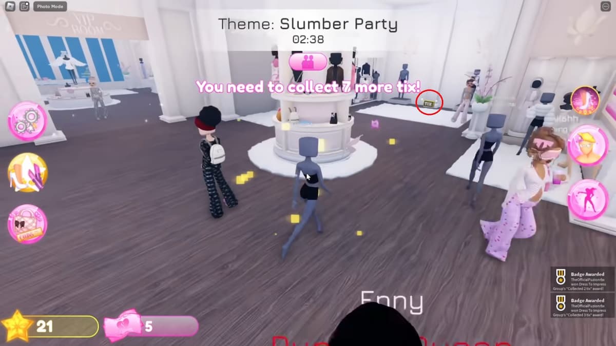 В увлекательной атмосфере «Dress to Impress» получить билеты не составит труда. Вам просто нужно сделать короткую паузу между приобретениями. Билеты удобно выделяются: три из них находятся в зоне ожидания перед входом, а остальные семь — в раздевалке перед парадным входом.